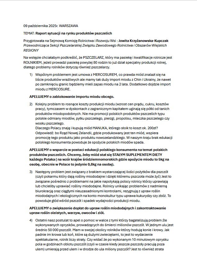 Poniżej wystąpienie p. Jowity podczas posiedzenia Sejmowej Komisji Rolnictwa w dniu 9 października, poświęconego problemom produkcji miodu i sytuacji na rynku miodu w Polsce.